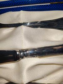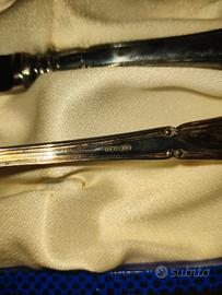 Vendo set di posate per bambino (cucchiaio, forchetta, coltello) in Argento 800. Un oggetto di alta manifattura italiana realizzato dalla Argenteria Vicentina (punzone di fabbrica 230 VI chiaramente visibile). Dettagli tecnici: Materiale: Argento 800. Peso totale: 82 grammi. Lama coltello: In acciaio inossidabile per garantire funzionalità e durata. Accessori: Completo di scatola originale con motivo blu. Condizioni: Ottimo stato vintage. Presenta la naturale patina del tempo (facilmente lucidabile) che ne garantisce l’autenticità. Perfetto come regalo di prestigio per Battesimo, Nascita o primo compleanno.