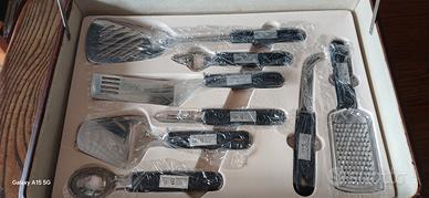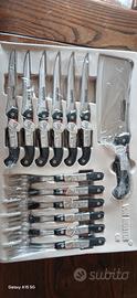 Favoloso servizio completo posate da bistecca e barbecue per 6 persone composto da 24 pezzi compreso affilatore forbicioni tranciat bistecca paletta apriscatola/bottiglia paletta seghettata pelapatate paletta tagliaverdurre cucchiaio condimenti coltellino con lingua grattugina mannaia in acciaio inossidabile disegnato e fatto a mano, Marchio SOLINGEN VON MEISTER CE, con valigetta. Nuovo.