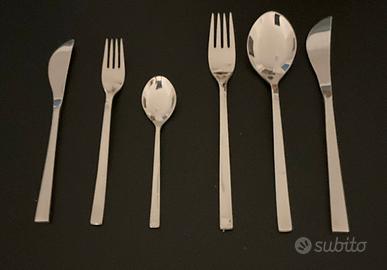 Posate Calderoni Servizio 73 pezzi posate Calderoni modello Maratea in acciaio inox: 12 cucchiai, 12 forchette, 12 coltelli, 12 cucchiaini, 12 forchette frutta, 12 coltelli frutta, 1 mestolo. Ottimo stato. Ritiro a Milano Euro 350