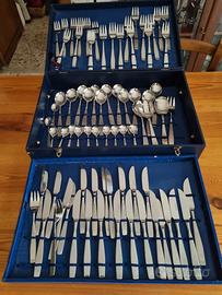 Vendo servizio posate Cook-o-Matic originale americano del 1970, in puro acciaio, completo di scatola. Come nuovo, qualche pezzo usato poche volte. Composto da 77 pezzi. Sono ancora in vendita eventuali ricambi. Valuto serie proposte.