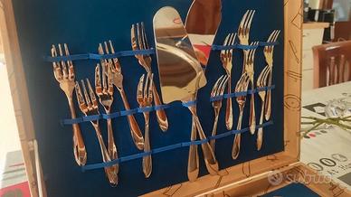 Set composto da vassoio , 12 forchettine, coltello dolce e paletta . Acciaio inox con lavorazione in oro zecchino 24 k. Presente certificato di garanzia. Nuovo, ancora nella sua confezione integra. Mai usato.