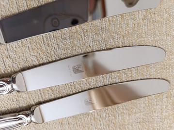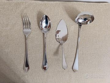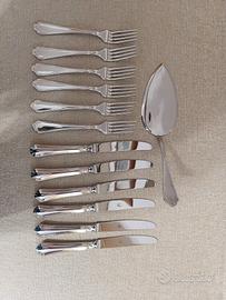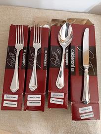 Servizio posate fratelli Calderoni Modello Ambassador X 12 coperti : 12 coltelli da tavola 12 cucchiai da tavola 24 forchette da tavola 12 forchette frutta 12 coltelli frutta 12 forchettine torta 12 cucchiaini 1+1 cucchiaio e forchetta per servire 1 mestolo 1 paletta torta Totale 100 pezzi. Imballaggio originale, mai utilizzati.