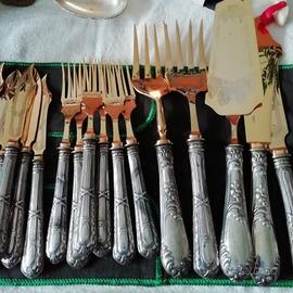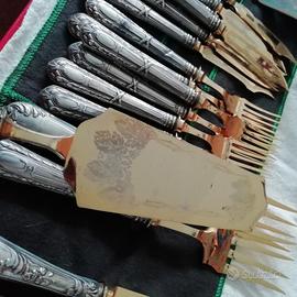 Antico servizio di posate da dessert, inizio 900, composto da: 6 forchette e 6coltelli decorati, paletta da torta, 2 forchette grandi e 2 coltelli da servizio lo.