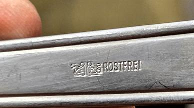 Servizio completo, con scatole originali, di posate vintage tedesche in acciaio inox, marchio Pfeifen-Männchen, produzione Germania (area Solingen, zona famosa per coltelleria e acciai di qualità), anni ’60-’70, con scatole originali (il cartoncino ha subito normali segni del tempo).