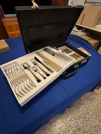 Vendo elegante set di posate Inoxpran in acciaio inox 18/10 placcate in oro 24 carati, completo per 12 persone (totale 75 pezzi). Il servizio è nuovo, mai utilizzato, conservato con cura nella sua raffinata valigia, Acciaio inox 18/10 di alta qualità - Placcatura in oro 24 carati - Servizio completo da 12 persone (72+3pezzi) - Certificato di garanzia incluso Condizioni pari al nuovo IMPORTANTE: poiché non rispondo a numeri sconosciuti, per il primo contatto mandatemi un SMS o WhatsApp e vi richiamo io. GRAZIE