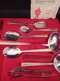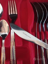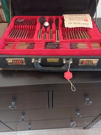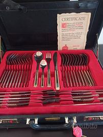 servizio posate completo da 12 persone Marca Solingen in valigetta in similpelle con chiusura a combinazione in acciaio inox 18/10 con particolari color oro