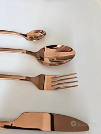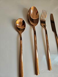 Set servizio posate in metallo colore rame (o oro rosa) da 24 pezzi di linea moderna contemporaneo design: 6 x forchetta, coltello, cucchiaio, chicciaino da dessert caffè.