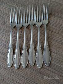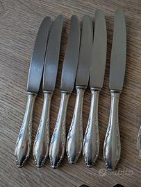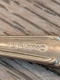 Servizio da 6 di posate Valsodo ES sigla che solitamente indica "extra strong" riferendosi a una qualità superiore dell'acciaio utilizzato: Si tratta di una dicitura di pregio del marchio. Si compone di 6 coltelli da tavola, 6 cucchiai, 6 forchette, 6 cucchiaiotti da dolce. Il manico presenta un delicato motivo a foglioline . Eventualmente sono disponibili anche 5 forchettine da frutta, 5 coltellini da frutta e 5 cucchiaini da caffè (non considerati nel prezzo esposto)