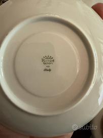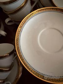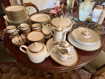Vendo importante servizio Richard Ginori 1G Italy in porcellana bianca con elegante bordo oro, tutto della stessa marca e con la stessa decorazione. Servizio per 12 persone composto da 12 piatti piani, 12 piatti fondi, 12 piattini, 12 tazze da tè con relativi piattini, più vassoio ovale, vassoio tondo, insalatiera/portainsalata, teiera, zuccheriera, due bricchetti e altri pezzi coordinati con coperchio visibili in foto; presenti anche 3 tazzine da caffè con 3 piattini.