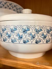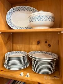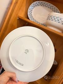 Splendido servizio di piatti in pregiata porcellana Richard Ginori, manifattura italiana di altissima qualità. Il set presenta l'elegante decoro blu a motivi floreali/geometrici della linea "Gran Fuoco", celebre per la sua incredibile resistenza e brillantezza nel tempo. 26 pezzi piu vassoio e zuppiera