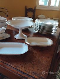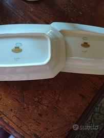 servizio Doccia manifattura per Magazzini Richard Ginori , secondo quarto del XXsec.Porcelkana R.Ginori per Magazzini Richard Ginori Mi, via Dante, in cartiglio oro con corona.Una zuppiera, un piatto da portata rettangolare, una salsiera, due piattini rettangolari, 19 piatti con 12 lati, una alzatina.Tutto il servizio 139euro, se si vuole anche l'alzatina aggiungere 25 euro.