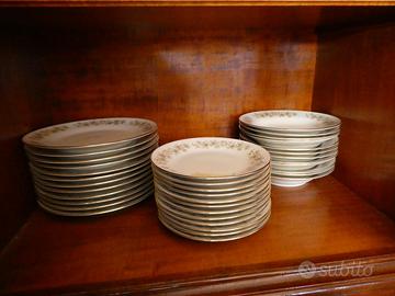 Servizio piatti Richard Ginori , composto da 12 piani, 12 fondi, 12 piccoli, 1 terrina, un piatto portata ovale e un piatto portata tondo. Bordo oro e festone con fiori gialli e foglie, in perfette condizioni.