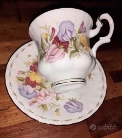 Sono in porcellana Bone China con profili in oro, Marca Royal Albert modello FLOWER OF THE MONTH SERIES Made in England, ogni TAZZA raffigura fiori del mese. JANUARY: gennaio fiore bucaneve FEBRUARY: febbraio fiore violette MARCH: marzo fiore anemoni APRIL: aprile fiore pisello odoroso MAY: maggio fiore mughetti JUNE: giugno fiore rose JULY: luglio fiore non ti scordar di me AUGUST: agosto fiore papaveri SEPTEMBER: settembre fiore margherita di San Michele OCTOBER: ottobre fiore cosmo NOVEMBER: novembre fiore crisantemo DECEMBER: dicembre fiore rosa di Natale