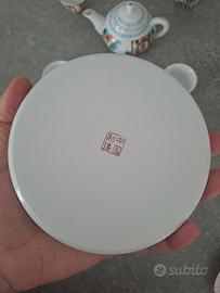 Servizio cinese per sakè con piatto, teiera e 4 bicchierini. Uno ha un segno di fabbricazione all'interno visibile nelle foto.
