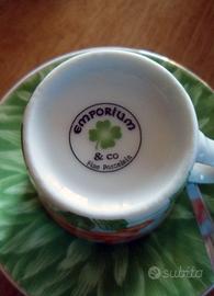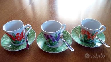 Set di sei tazzine da caffè con motivi floreali bordate in oro, con piattino in coordinato. Realizzate in porcellana finissima. Spese di spedizione a carico del destinatario.