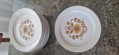 Delicato servizio di piatti vintage manifattura tedesca Colditz (made in GDR) in porcellana bianca con soggetto floreale composto da 10 piatti piani, 11 piatti fondi, 12 piattini frutta, una insalatiera, 2 piatti da portata e 2 vassoi rettangolari.