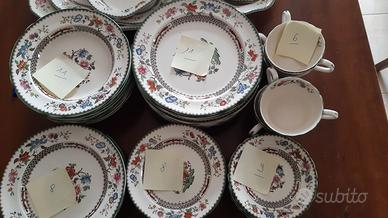 Il motivo stesso è immediatamente riconoscibile: fiori riccamente dipinti a mano in rosa intenso, verde smeraldo e blu tenue, incorniciati da delicati dettagli neri e da un bordo verde smerlato. A differenza del transferware che ha dominato la tavola inglese, molti elementi di questo servizio portano la mano del pittore, rendendo ogni