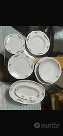 Composto da zuppiera con coperchio, antipastiera, piatto portata, insalatiera con sottopiatto, 6 fondi, 5 piani e 6 piattini