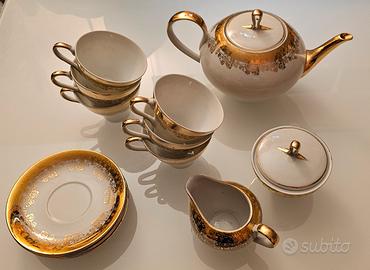 Servizio da the o caffe' in fine porcellana Barese del XX secolo anni 70 con decorazione floreale in oro. - 4 tazze con 4 piattini - 1 zuccherieracon coperchio - 1 lattiera - 1 teiera con coperchio NON SPEDISCO!!!