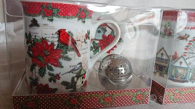Servizio da tè o tisana, ideale come regalo, composto da due tazze, filtro, e coperchio che diventa piattino per appoggiare l' infusore quando la bevanda è pronta. Mai utilizzate ancora nella confezione originale.