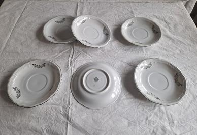 Vendo servizio da tè bavarese Leltmann Weiden – linea Marie Luise – in porcellana bianca modanata con decorazioni a tralci floreali argentati. Composto da 12 tazze, 12 piattini abbinati, teiera con coperchio e lattiera coordinate.