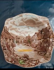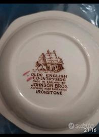 Servizio da torta o macedonia composto da 6 piattini e 6 coppette, 1 piatto grande e da 1 grande ciotola. Il servizio ritrae paesaggi della campagna inglese ed è prodotto da Johnson Bros England. I piatti da portata sono splendidi da utilizzare semplicemente come esposizione.