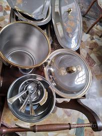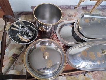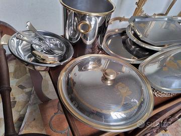 Servizio da tavolo in Oro 24 Kt e Inox 18/10 comprendente: cestello vini, zuppiera, vassoi per salmone, portate di pescato, antipasti, 6 coppette gelato con cucchiaini coordinati. Tutto conservato con estrema cura, vendo €. 599. Disponibile a parte carrellino ( in foto ) in mogano con rotelline direzionali a €. 250.