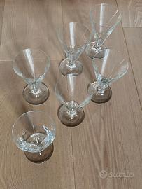 Servizio vintage fuori produzione di 6 bicchieri da vino Luigi Bormioli collezione Mantegna, serie Light & Music in vetro sonoro superiore soffiato. Altezza cm. 14,6; diametro base cm. 7, superiore cm. 7,6. Eccellenti condizioni, non scheggiature o crepe: vedere foto.