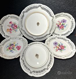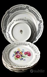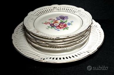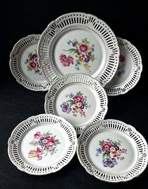 Regalate a voi stessi o ai vostri cari un pezzo di raffinata estetica tedesca, dove fiori e pizzi incontrano la storia e l'artigianato, trasformando ogni pausa tè in un piccolo rituale di bellezza. Elegante set di sei piatti vintage in ceramica con raffinato bordo traforato e delicati decori floreali. Ogni piatto racchiude in sé l'atmosfera dell'artigianato tedesco della metà del XX secolo, confermata dal marchio del produttore sul fondo: “Germany Schwarzenhammer”.