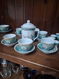 Perfetti ed integri, 6 tazze da the col loro piattino più teiera, 6 da caffè con piattino più zuccheriera, 9 bicchierini da sake più relativo contenitore. Acquistato nei primi anni '90, altro non sono in grado di dire. Solo ritiro a mano. Valuto Solo offerte decenti