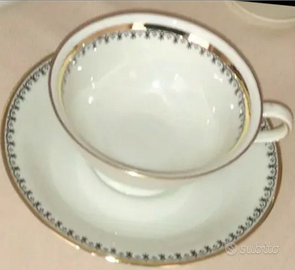Servizio da caffè completo in porcellana fine con decorazioni in oro. Comprende 12 tazzine con piattini, due caffettiere, due zuccheriere e due lattiere. Eventualmente scomponibile dall'acquirente in due servizi da 6.