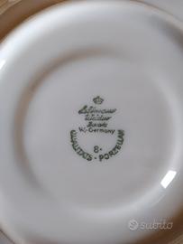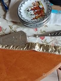 Servizio vintage con piattini chinoise )a tema cinese, con dame, salice piangente ed edificio con tetto a pagoda, anni 70-80. con bordo argentato da dessert anni 70-80, 6 piattini con bordo argentato, in ceramica di Bavaria, poi paletta e 12 forchettine con manico argentato (argento 1000)