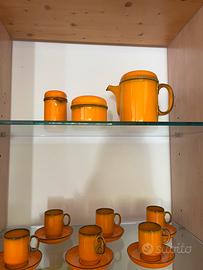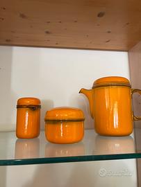 Raro Servizio da Caffè Vintage THOMAS GERMANY (Gruppo Rosenthal) Anni '70 - Arancione e Marrone, 15 Pezzi In vendita uno splendido e raro servizio da caffè vintage completo, prodotto negli anni '70 dalla rinomata manifattura tedesca Thomas Germany (membro del prestigioso Gruppo Rosenthal). Questo set è un perfetto esempio del design "Space Age" dell'epoca, caratterizzato da un vibrante colore arancione acceso smaltato con dettagli e bordi marrone scuro sfumati. Marchio: Thomas Germany (come mostrato nella foto del marchio sul fondo). Epoca: Anni '70. Stile: Mid-Century Modern / Space Age. Composizione del Set (totale 15 pezzi): • N. 6 Tazzine da caffè • N. 6 Piattini coordinati • N. 1 Teiera/Caffettiera alta con coperchio • N. 1 Lattiera alta con beccuccio • N. 1 Zuccheriera con coperchio Condizioni: Il servizio è in perfette condizioni vintage. Non sono presenti sbeccature, crepe o restauri visibili. Lo smalto è lucido e i colori sono vividi. Perché Acquistare Questo Set? • Autentico Pezzo Vintage: Un pezzo di storia del design degli anni '70 per la vostra cucina o collezione. • Qualità Thomas/Rosenthal: Prodotto da uno dei nomi più prestigiosi della ceramica tedesca, noto per la sua qualità e design. • Set Completo: Difficile da trovare completo di teiera, lattiera e zuccheriera coordinati. • Design Unico: Il contrasto cromatico e le forme geometriche lo rendono un oggetto d'arredo accattivante anche quando non in uso.