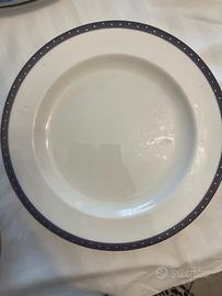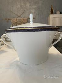 Servizio Wedgwood modello “Midnight” in porcellana inglese di alta qualità. Elegante decoro blu con finiture dorate, ideale per tavole importanti e occasioni speciali. Il servizio comprende: - Piatti piani: 10 pezzi - Piatti fondi: 18 pezzi - Piatto da zuppa: 7 pezzi - Tazze da caffè con piattino: 5 pezzi di tazzine e 10 pezzi di piattini - Tazze da te con piattino: 5 pezzi di tazze da te e 11 piattini -Tazze grandi con piattino: 6 pezzi di tazze tazze grandi e 10 piattini - Piatto da portata grande: 2 pezzi ovali 1 pezzo tonto e 1 pezzo quadrato - Zuppiera con coperchio: 1 pezzo - Insalatiera: 1 pezzo - Salsiera: 1 pezzo - Ziccheriera con coperchio: 1 pezzo Condizioni molto buone, con normali segni d’uso ma senza rotture. Marchio Wedgwood, sinonimo di eleganza e qualità nel mondo della porcellana. Vendita preferibilmente in blocco o in alternativa servizio da sei Prezzo: € 1800,00