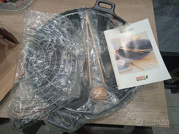 Servizio wok 5 pezzi mai utilizzato con pentola coperchio griglia pinzette e ricettario