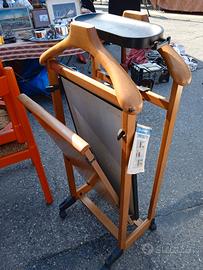 La struttura è in legno massiccio di faggio, pannello imbottito e elettrificato per tenere in piega i pantaloni, solido e durevole nel tempo grazie alla struttura in legno massiccio, dotato di tutti gli accessori per riporre gli abiti in modo ordinato, pratico svuotatasche porta oggetti, spazio per riporre anche le scarpe, ruote piroettanti per facilitare gli spostamenti