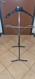 Design Aerodinamico, la gruccia superiore presenta una linea fluida e bombata in legno nero, tipica dell'estetica "atomica" e spaziale del tempo. Supporto in metallo nero con incrocio a forbice, elegante e minimale. Barra portapantaloni in metallo cromato, che crea un contrasto perfetto con il corpo scuro dell'oggetto.