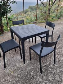 1 tavolo quadrato (lato 1 metro) con 4 sedie. Ideale per giardino privato o attività commerciali. Usato solo 1 mese. Disponibile in più set.
