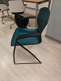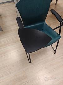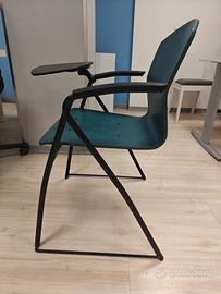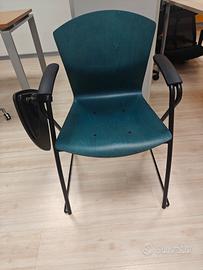 11 sedie design per meeting con tavoletta, ideali per sala corsi e conferenze. Scocca in legno faggio tinto colore verde petrolio, struttura in acciaio verniciato nero, tavoletta nera sagomata con rotazione e aggancio antipanico. Il valore iniziale della singola sedia era di circa 250 euro. Alcune sedute possono presentare piccole imperfezioni di poco conto. Consegna 50 euro nel raggio di 100 km (Biella), oltre su accordi. Fattura disponibile per acquisto aziendale.