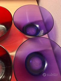 rosse, arancio, verde, viola, azzurro, trasparente ( per ogni colore ci sono due ciotole)