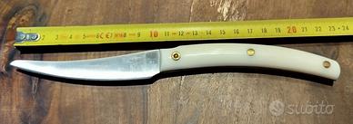 In vendita un esclusivo set di 12 coltelli da tavola a lama fissa "Convivio Nuovo" di Coltellerie Berti, un pezzo di tradizione artigianale italiana direttamente da Scarperia. Caratteristiche Principali Questi coltelli sono una reinterpretazione moderna della storica "Coltellina di Scarperia" degli anni '20 e '30. Lama Liscia e Affilata: A differenza delle lame seghettate, la lama liscia in acciaio inox (o carbonio a seconda della versione specifica) garantisce un taglio dolce e preciso che non sfibra la carne e ne preserva il gusto. Artigianato di Qualità: Prodotti dalla famiglia Berti, coltellinai dal 1895, questi coltelli sono realizzati con manici in plastica (o metacrilato/bachelite) lavorati a mano. Duraturi e Affilabili: Progettati per durare nel tempo, possono essere riaffilati presso coltellerie specializzate, a differenza delle lame seghettate usa e getta. Design Elegante: Le linee semplici ed eleganti si adattano perfettamente a qualsiasi tavola. Dettagli del Prodotto Marca: Coltellerie Berti 1895 Modello: Convivio Nuovo Tipo: Coltello a lama fissa per la tavola Quantità: Set da 12 pezzi Materiale Lama: Acciaio Materiale Manico: Plastica lavorata a mano Condizione: Nuovo mai usato Il prezzo si riferisce a tutta la confezione