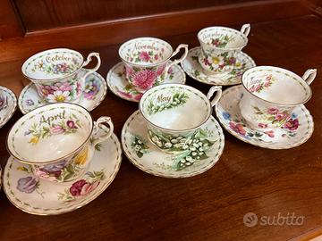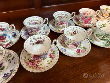 Il set da 12 mesi "Flower of the Month" (Fiore del Mese) di Royal Albert è una celebre collezione di stoviglie in fine bone china inglese. Originariamente prodotta tra gli anni '50 e '70, ogni pezzo è un set individuale di tazza e piattino (a volte anche piattino laterale, noto come "trio").