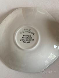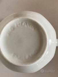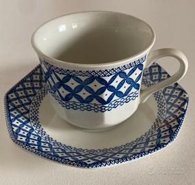 Set 12 tazzine da caffè con decoro blu di forma ottagonale. Prodotto negli anni '70 nel Regno Unito secondo lo stile della ceramica artistica. Piattino marcato in blu: Royal Staffordshire Wicker Ironstone J. & G. Meakin England. Tazzina marcata in bianco: J. & G. Meakin England. Misure: tazzina h. cm. 6, larghezza cm. 8 (con manico cm.10); piattino: diametro cm. 13