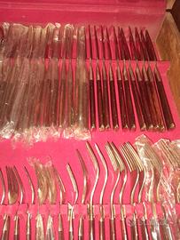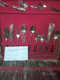 Servizio di posate in nickel-bronzo e legno molto pregiato e ben fatto per aggiungere un tocco speciale al tuo servizio in tavola! Si tratta di un set di posate per 12 tutto in ottime condizioni vintage, senza graffi, senza spaccature, il 90% dei pezzi ancora sigillati inseriti in un bauletto in legno il valore èdi oltre 500 euro. Vedere le immagini per maggiori dettagli. Il set di 144 pezzi cosi composto: