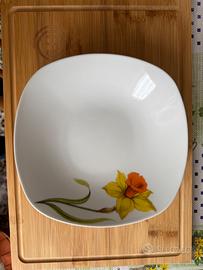Set piatti di porcellana, insalatiera, e tazzine con narcisi. Si compone di 6 piattini da dolce, 6 piatti piani, 6 piatti fondi, 1 insalatiera, 6 tazzine da espresso e 6 piattini per tazzine. In perfette condizioni, mai usati.