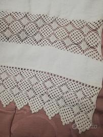 Bellissimo set di 2 asciugamani bianchi, viso e ospite, degli anni 70. Di cotone, con inserti di pizzo fatti a mano a uncinetto. In perfette condizioni, mai utilizzato. A causa del trascorrere del tempo, sono presenti alcune macchie gialle, facilmente rimovibili. Contenuti nel sacchetto originale.