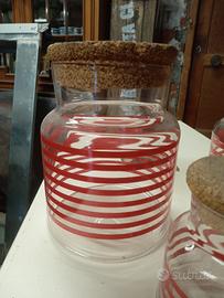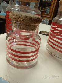 Vendo bellissimo set di 2 barattoli in vetro trasparente con decorazioni rosse e tappi in sughero. Sono perfetti per conservare spezie, biscotti o altri alimenti.