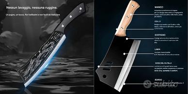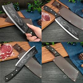 - SET DI 2 - ASCIA 1 - Coltello Del Drago Fatto A Mano Robusto e Foderato - ROBUSTO & FODERATO Coltello da cucina tritatutto per ossa coltello da macellaio coltello dal taglio affilato forgiato a mano coltello da cucina multiuso Categoria prodotto: coltello da cucina Materiale: acciaio inossidabile ad alto tenore di carbonio Angolo della punta dell'utensile: più di 60° Materiale lama: acciaio serie 5Cr Lunghezza del manico - 11cm Lunghezza della lama - 20cm Materiale della lama - acciaio al carbonio Dragon Cacciatore fatto a mano Anticorrosione , buona resistenza, buona tenacità. Più piccolo è il bordo, più nitido è, mantenendo la sensazione di taglio. Coltello Da Cucina Affilato da 8,2 pollici Acciaio forgiato monolitico durevole nel tempo. Design in argento lucido, la fermezza è 5 volte quella del coltello normale. Realizzato in acciaio inossidabile, forgiatura strato per strato, elevata durezza. Coltello da chef professionale Il manico ergonomico in legno riduce notevolmente la tensione del polso e crea una presa morbida e confortevole. Materiale di alta qualità Acciaio forgiato monolitico durevole nel tempo. Design in argento lucido, la fermezza è 5 volte quella del coltello normale. Realizzato in acciaio inossidabile, forgiatura strato per strato, elevata durezza Queste lame lunghe e flessibili sono progettate per tagliare grandi pezzi di carne e lo fanno in modo elegante 1 - È normale che il coltello per affettare ricevuto presenti un po' di olio attaccato alla lama, il che serve a proteggere il coltello. 2 - Per una lunga durata, mantenere il lungo coltello da cucina asciutto e pulito dopo ogni utilizzo e oliarlo regola - ASCIA 2 COLTELLO PER OSSA Coltello da Chef per Ossa ad Alta Durezza Alto Tenore di Carbonio Stile Ascia Coltello da cucina per ossa stile ascia ad alta durezza ù Lunghezza Piena - 29 cm Lunghezza Del Manico - 10.5cm Lunghezza Della Lama - 18.5 cm Materiale Della Lama - ACCIAIO INOSSIDABILE Angolo Della Lama 60°