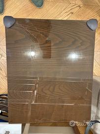Doppio cassetto scorrevole. Copertura in vetro fumeé e paraspigoli rimovibili.