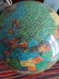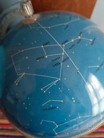 set di 2 mappamondi da tavolo, uno astronomico e uno terrestre. oggetti vintage, anni 60. meridiano in plastica trasparente, con base angolare in legno scuro. superficie dei globi ben conservata. no crepe no macchie. non possiedono luce interna.